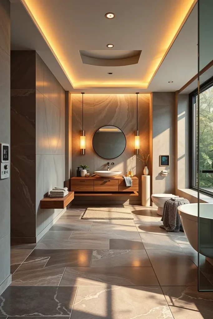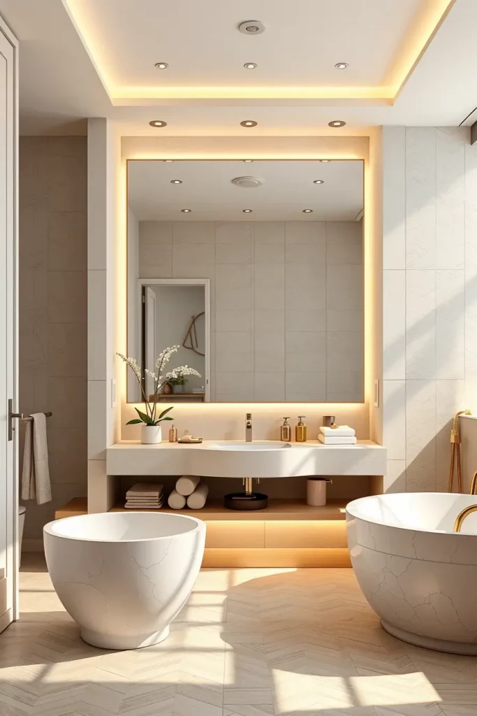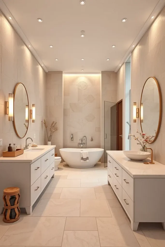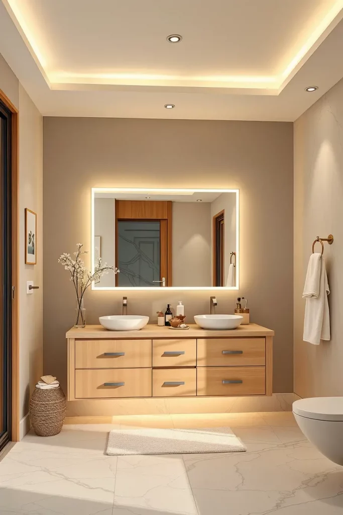 The only thing that I would add here is the voice-activated dimming system or app-controlled dimming to allow the user to regulate light with a touch or a voice command, which is a slight modification that can make the bathroom smarter and calmer.