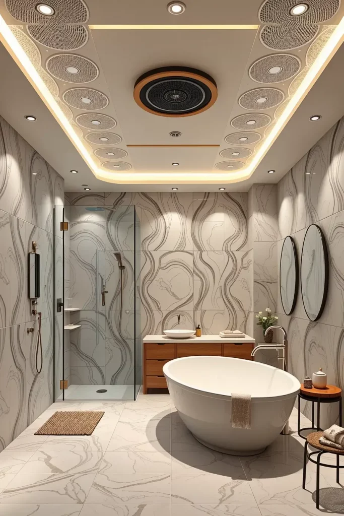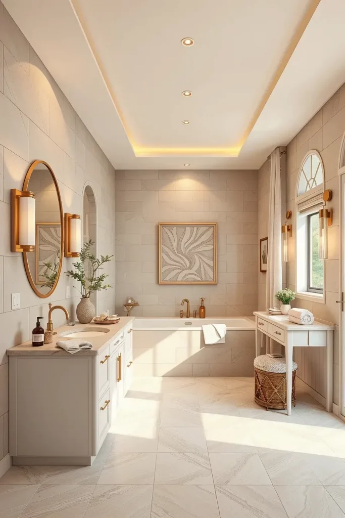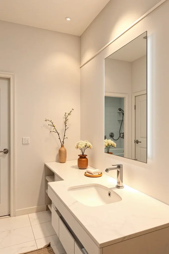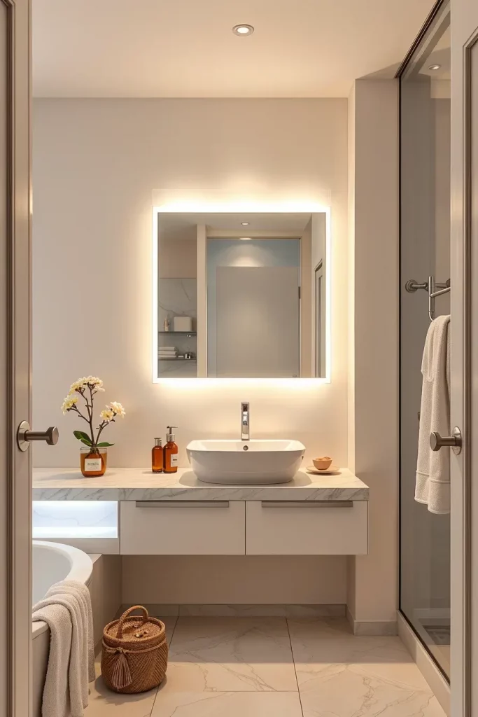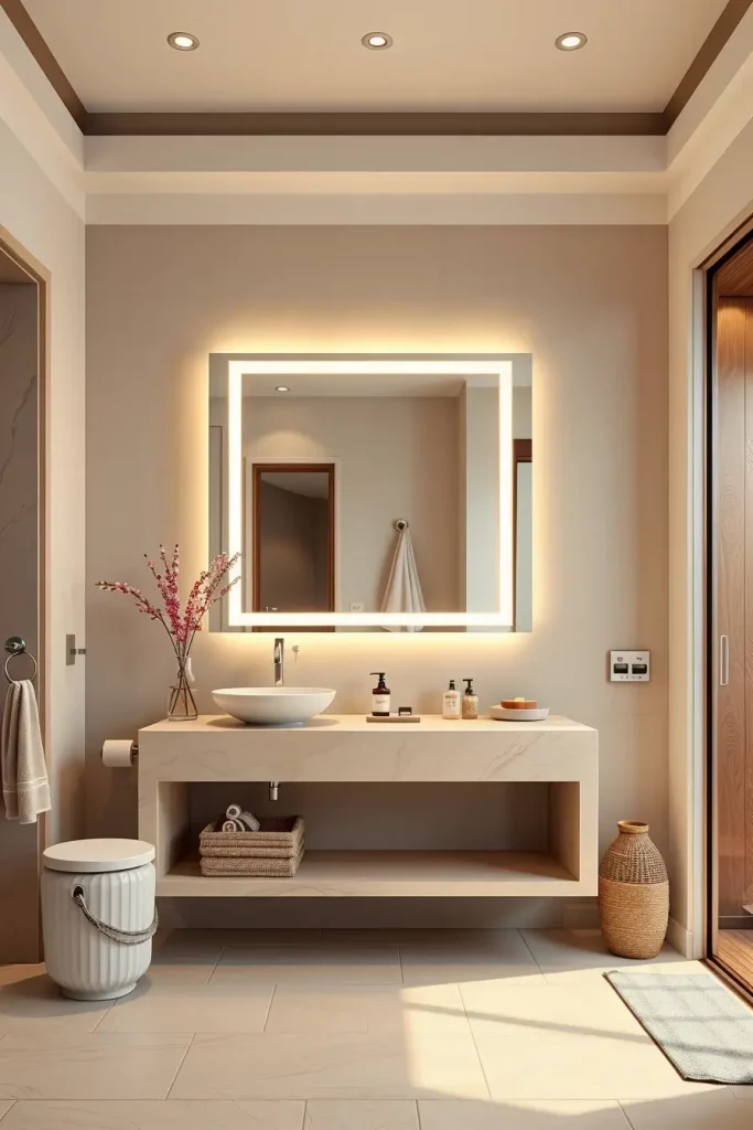 The only thing that I would add here is the voice-activated dimming system or app-controlled dimming to allow the user to regulate light with a touch or a voice command, which is a slight modification that can make the bathroom smarter and calmer.