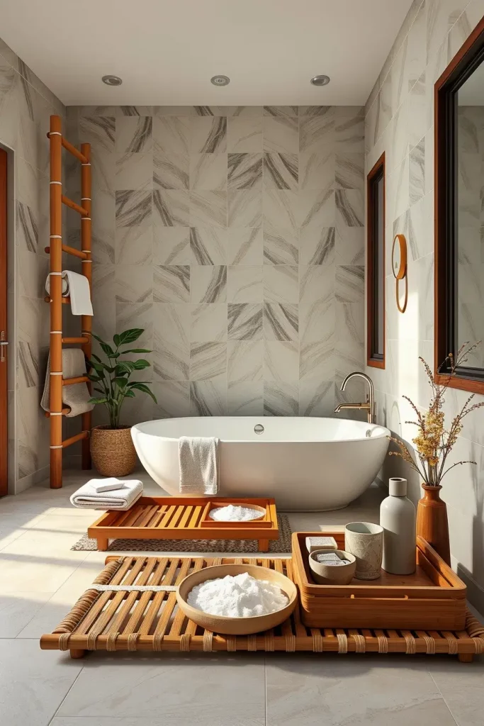 I choose a couple of pieces of bamboo–upholster a ladder of material like a toweling ladder, put a bath-salt tray in a rectangle and a slatted bath pan. Not only do these pieces appear pretty but also they work perfectly. A good idea is to put in bamboo stools or shelves arrangement surrounding tubs or showers as they are particularly humidity resistant.