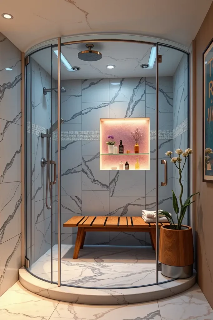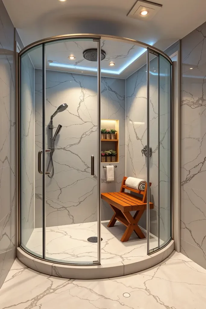 I have a steam shower designed using tiled ceiling and walls which are mostly mosaic or marble. The glass wants an enclosure that is completely gasketed and I like to add teak bench, a recess in which oil or towels can be held and a control panel where the temperature and time can be programmed. A good optional enhancement is chromotherapy lighting.
