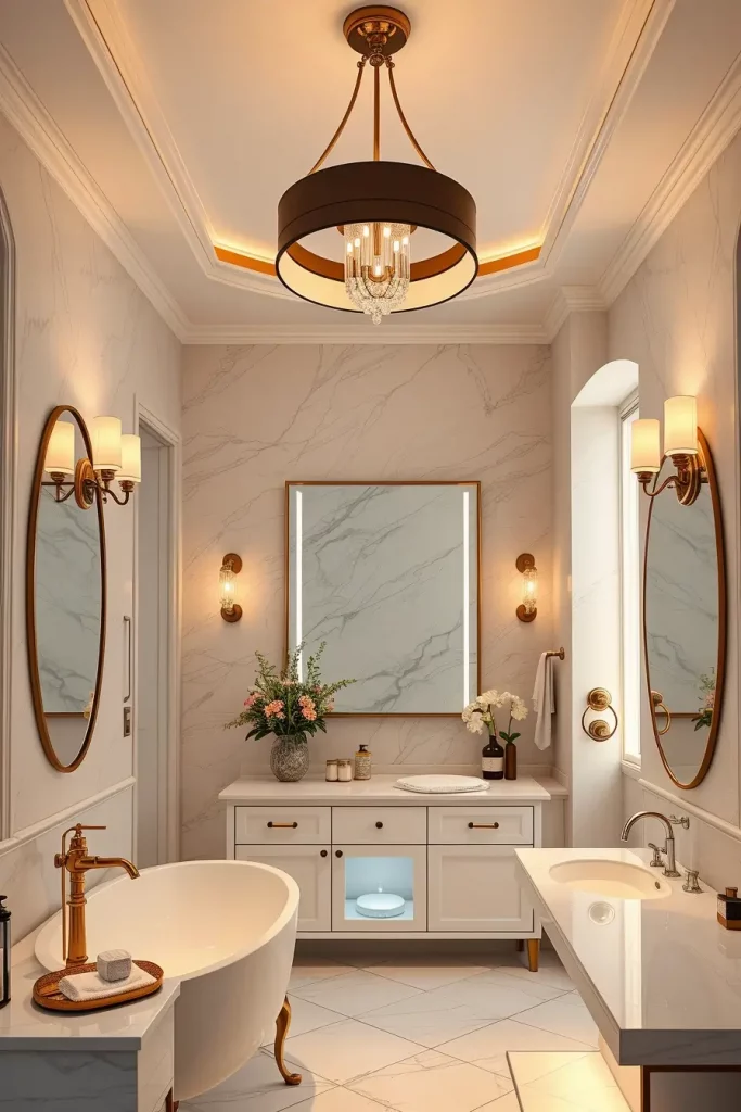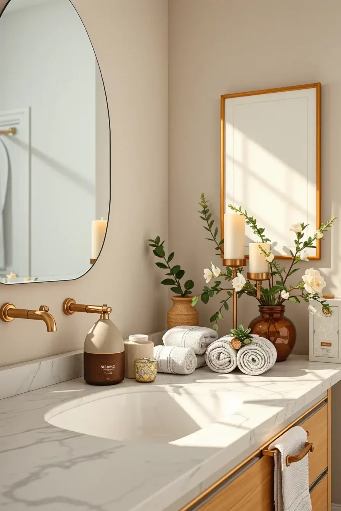 To make it more visible, you might want to have a carryover on the lighting fixture also or even into the mirrors. Such duplication establishes the optical balance and reaffirms the spa idea of sophistication.