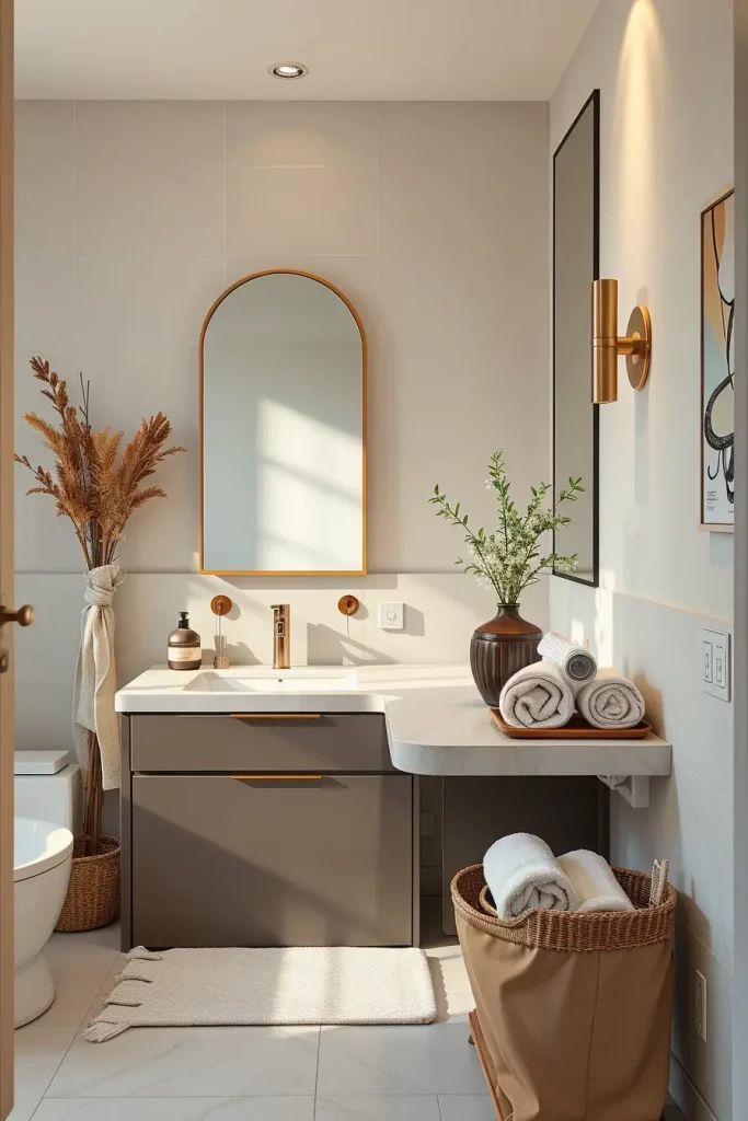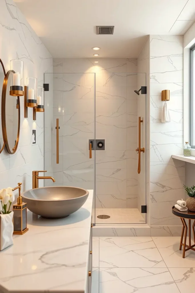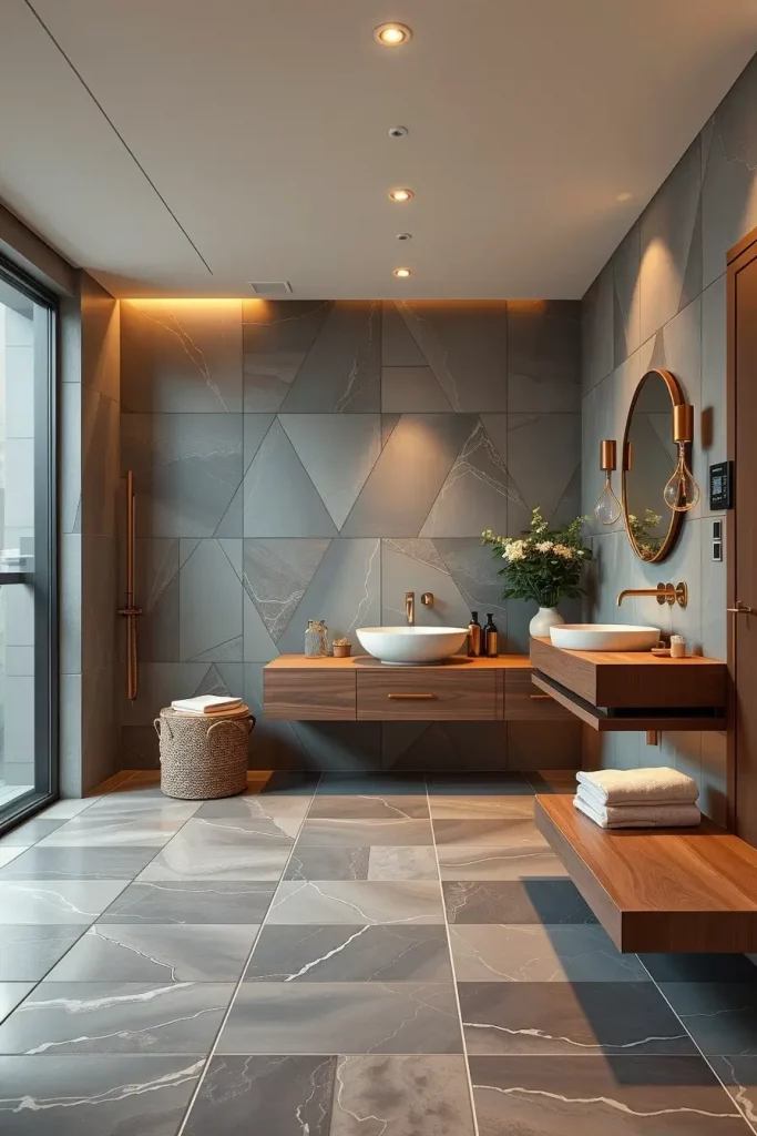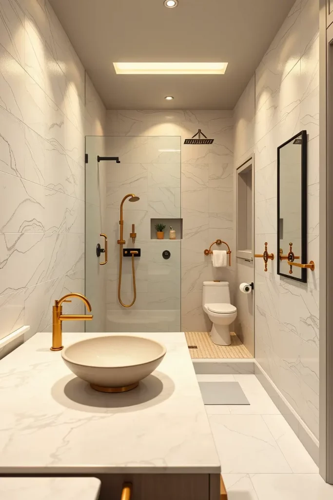 Whether it be in faucets, towel bars, shower heads, and the like, I like to ensure everything that is metallic in nature has the same matching effect. Matte black can bring about striking contrast to lighter bathrooms, whereas brushed gold can bring warmth and sophistication, and combining that with the texture of wood and stone. To eliminate the possibility of corrosion, I often advise to invest into top-quality finishes, which will be resistant to corrosion in a humid environment.