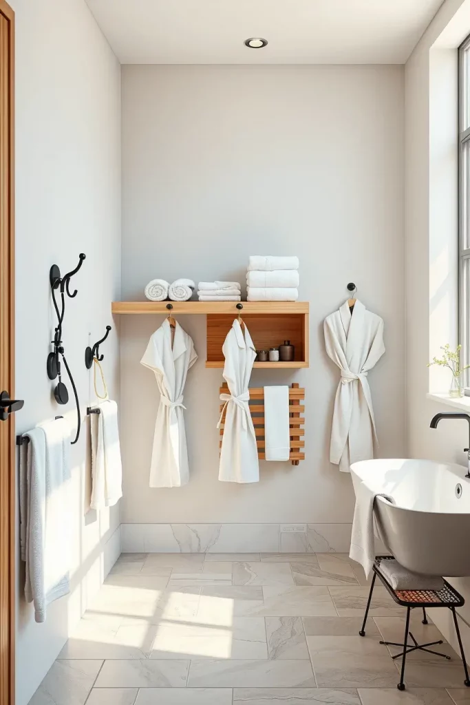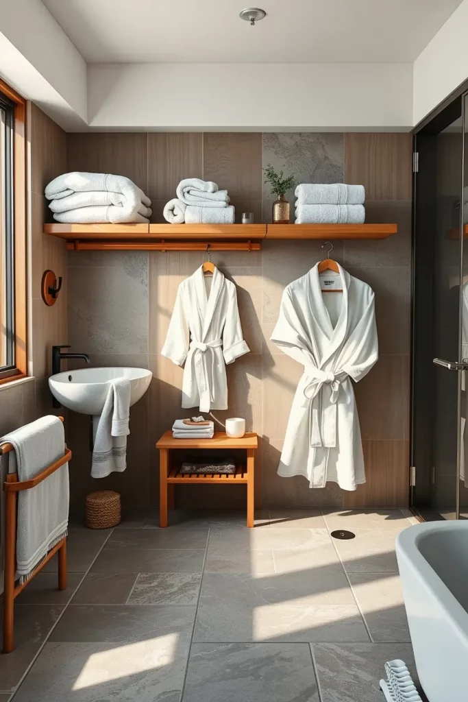 All should also be very white, including the bath towels and the robes in the traditional spa esthetics. I personally recommend organic cotton with a high GSM (grams per square meter), as they offer superior plushness. They can also be displayed on rolled stacks or hung using matte black hooks to create a better appearance and accessibility, especially in small designs of the bathroom.