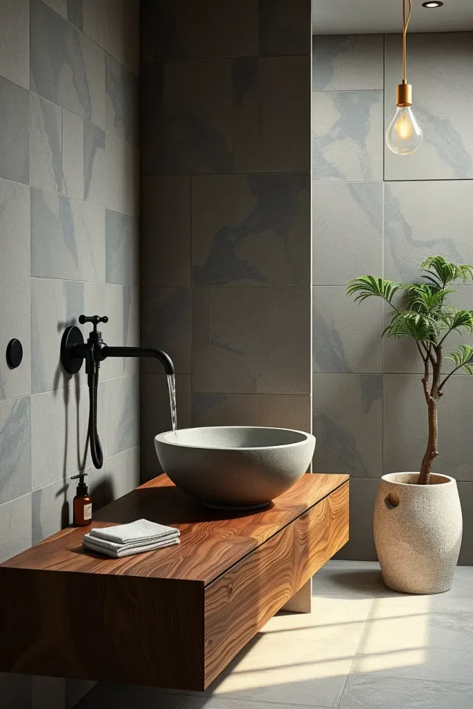 I usually combine these sinks with floating wood vanities or with thick concrete placers to emphasize the natural appearance. Matte finishes, especially those of black or grey color, fit into most color schemes without being too pretentious. I will go with Carrara marble, when I want elegance. And it I want rustic I could choose hand chiseled travertine or river rock.