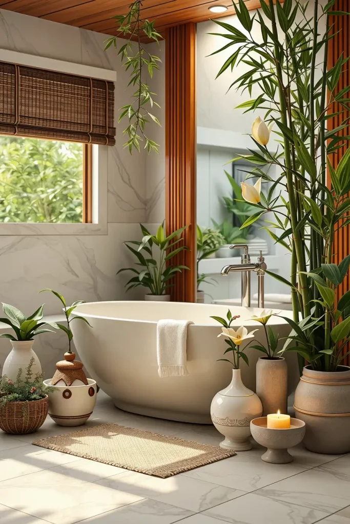 Another concept I would like to make in this concept would be to use bamboo-framed mirrors or teeth brushes holders so that there would be a consistency of design. The finishing of bamboo with its texture and tone can hold the scheme in so much beauty.