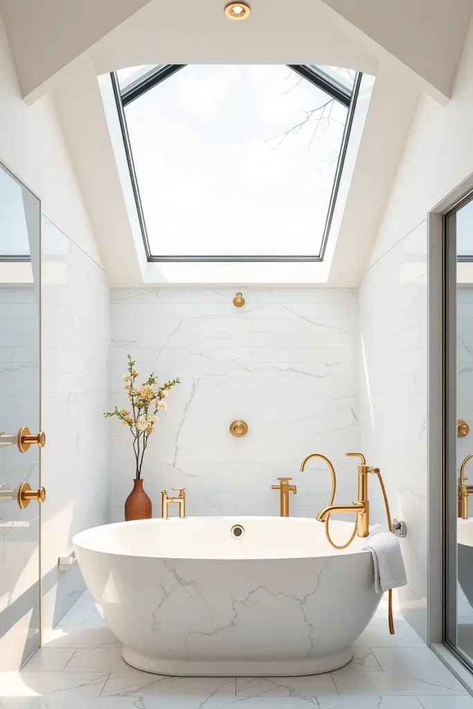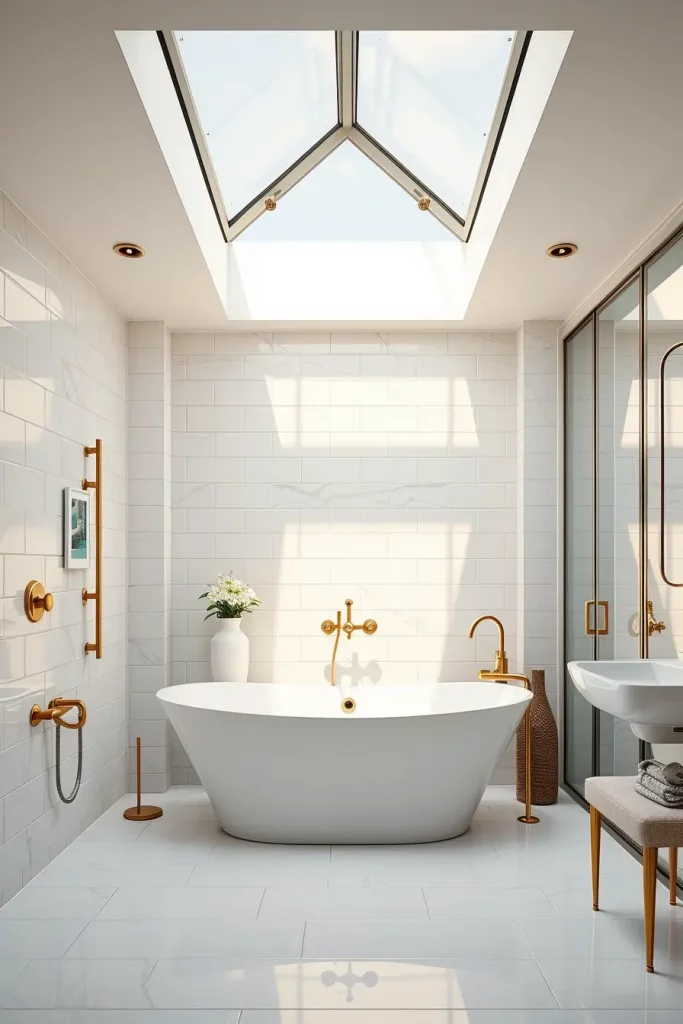 I would suggest having the skylights above the bathroom or shower so that it is the first noticable thing and would allow the individual viewing to relate themselves with the sky by visual seeing. In case of modern layouts, I have been fond of frameless glass skylight which retains as much light as possible without causing too much visual activity. When used in combination with reflective materials such as a light-colored tile or brushed in gold, the light reflects and enhances the perspective of the area.