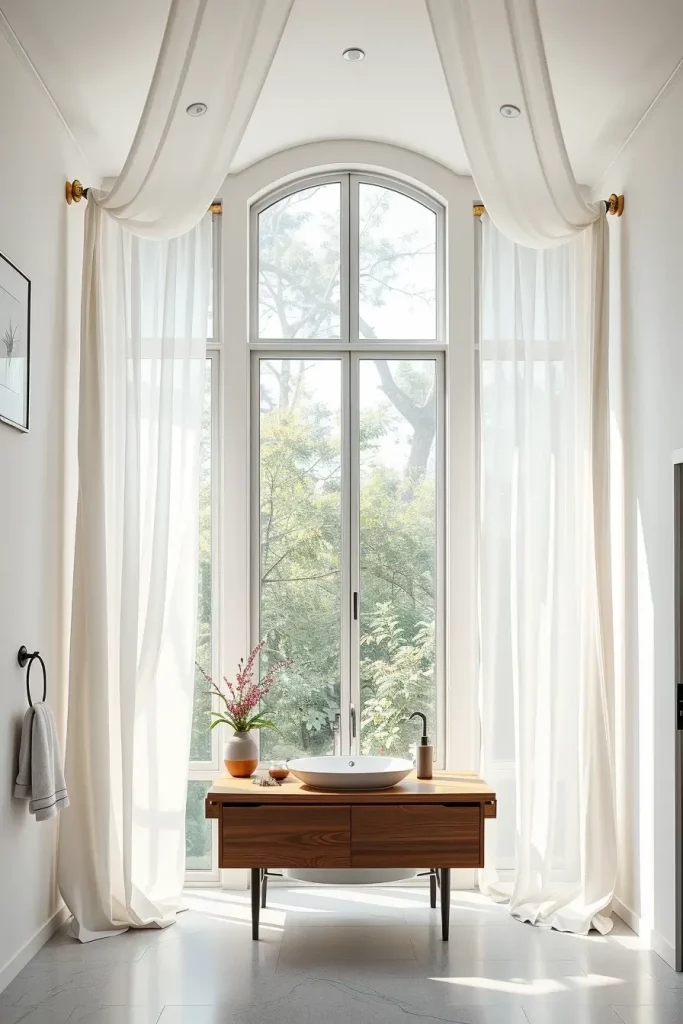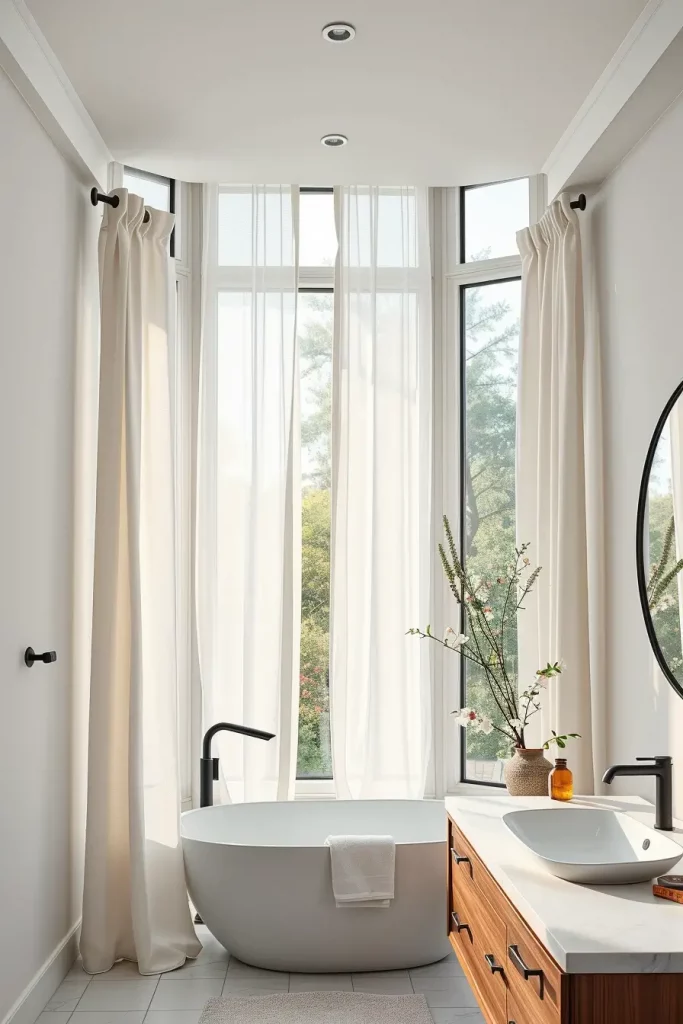 I prefer usable window coverings like linen or voile which are light and allow easy movement. Hanging down on the ceiling to the floor they stretch the walls and create an illusion of a larger bathroom. Muted colors such as an off beige or light grey blend into most color schemes best when other bare products are in matte black curtain rods or brushed metallic tracks to provide a high-end contrast.