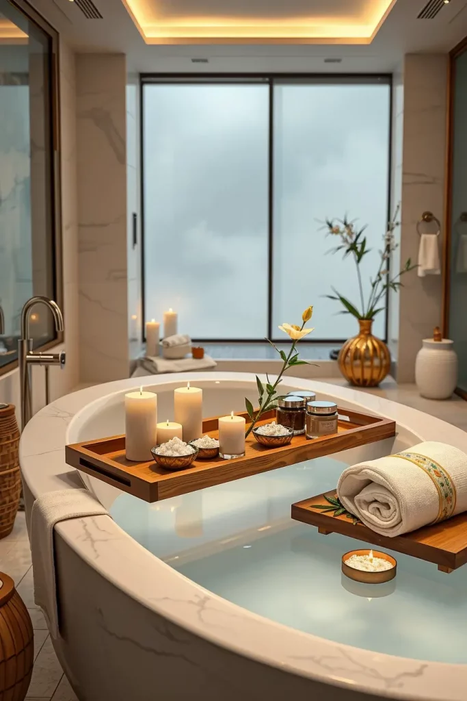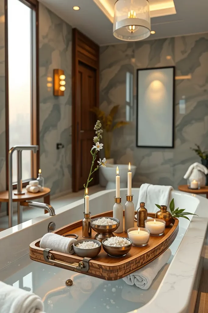 The things I get the most of, when making these trays, are scented candles, a little plant or flower stem, good quality bath salts, possibly a folded white towel or linen. The tray itself must be kept to the tone of the bathroom (preferably bamboo, teak or matte metal). I would recommend putting the tray right next to you so it could be reached using an arm, present in a minimalistic style to not attract much attention.