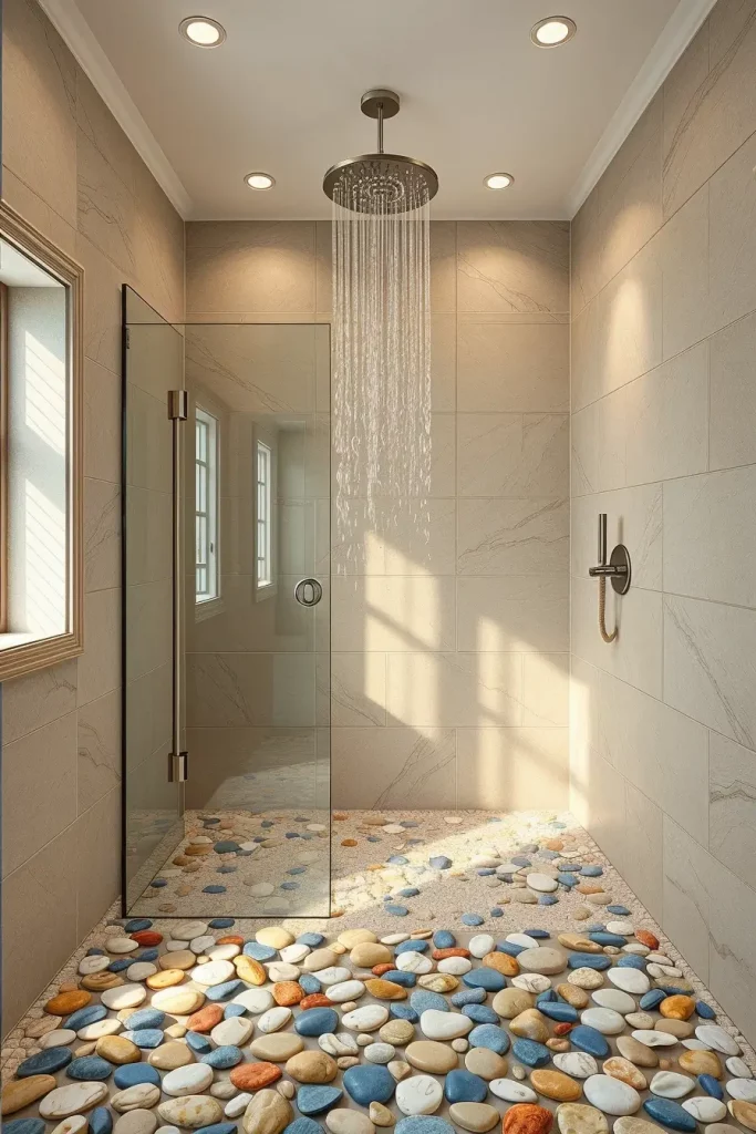 I found that a veritable natural material element in the bathroom, which is recommended by Hadley Keller, a journalist at the interior design magazine House Beautiful: the use of natural materials helps avoid the effect of too much clinicality of the space. Personally, I would use river rock in the showers to have an organic foot massage.