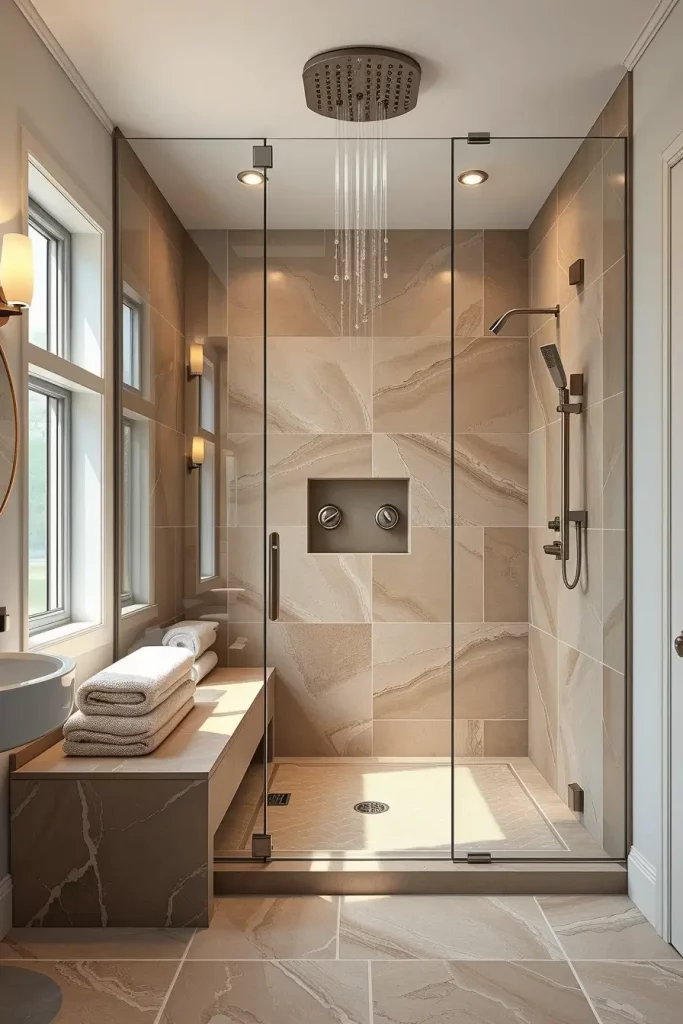 On minimalism, I use ceiling-mounted rain heads and linear drains, and I combine them with big textured tiles in pale earth color. Shelves are on the walls and there are also built in benches to bring convenience in design without the need to break the flow. Glass windows are either made clear or lightly frosted so as to be modest, particularly during multi-purpose areas.