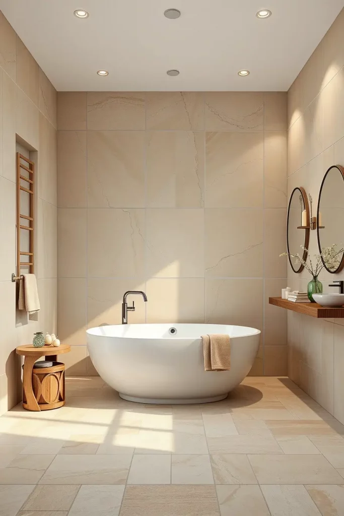 I would only suggest using large-format porcelain or natural stone tiles on the floor, but in a sandy or matte finish and complemented with white or light-wood cabinetry. The walls should be smooth or slightly textured and be painted in light taupe or greige to eliminate starkness. It is complemented by fluffy towels and a plain cotton bedding bench to store robes.