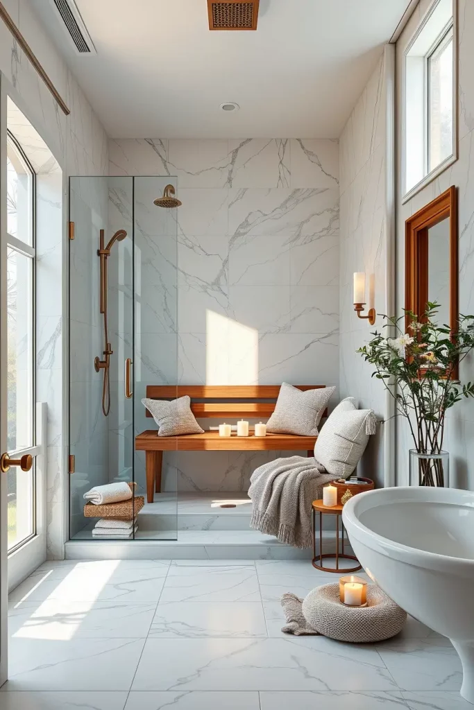 Built-in benches I would recommend using waterproof wood or natural stone (such as teak, cedar or marble) which are durable to dampness. They may be directly constructed to a walk-in-shower or under a frosted window, say, and with a soft cushion and a rolled towel in them. There is also a little side table with bath salts or a candle; they finish the relaxing touch.