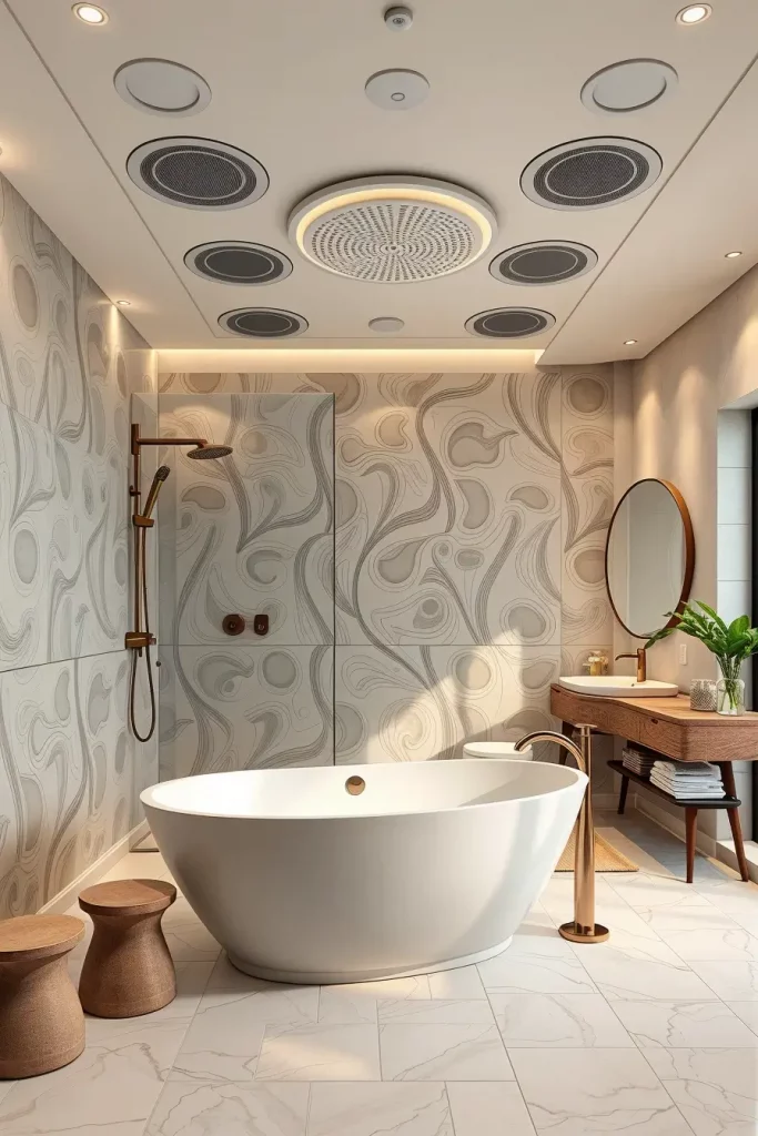 To achieve good sound design, I employ built-in ceiling or wall mounted Bluetooth speakers that can fit very well into the decor. All or part of waterproof models could be installed behind acoustic panels and even behind mirrors. Another idea I would consider is the use of acoustic dampening wall panels that are light, neutral and soft to avoid echoes, it will make the place feel intimate.