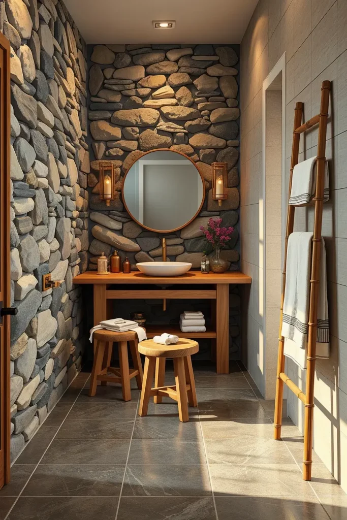 My preferred woodwork is wooden vanities, teak shelves and stone countertop. A chevron or a textured slate or travertine wall feature behind a mirror or bathtub will add a point of reference. Naturally, there is also a nice grounding effect in the otherwise sterile space is brought by the presence of a small wooden stool or a bamboo towel ladder.