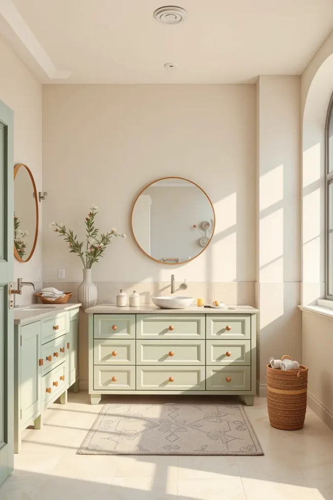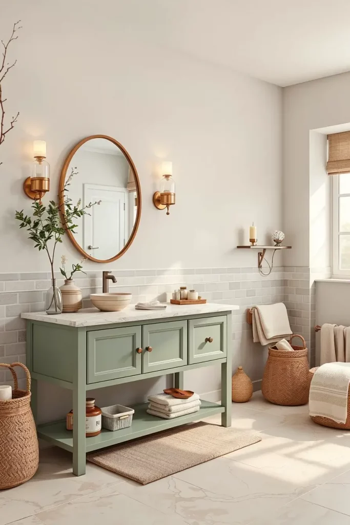 I fancy using these colors on walls, cabinetry and decorative tiles. Vanities with a soft green painted finish, e.g., are easy on the eyes, and inviting. It is finished off with matching bathmats and curtains or towels of similar colours. The vibe is held on even smaller color injections such as through ceramic containers or simplistic paintings without over cluttering.