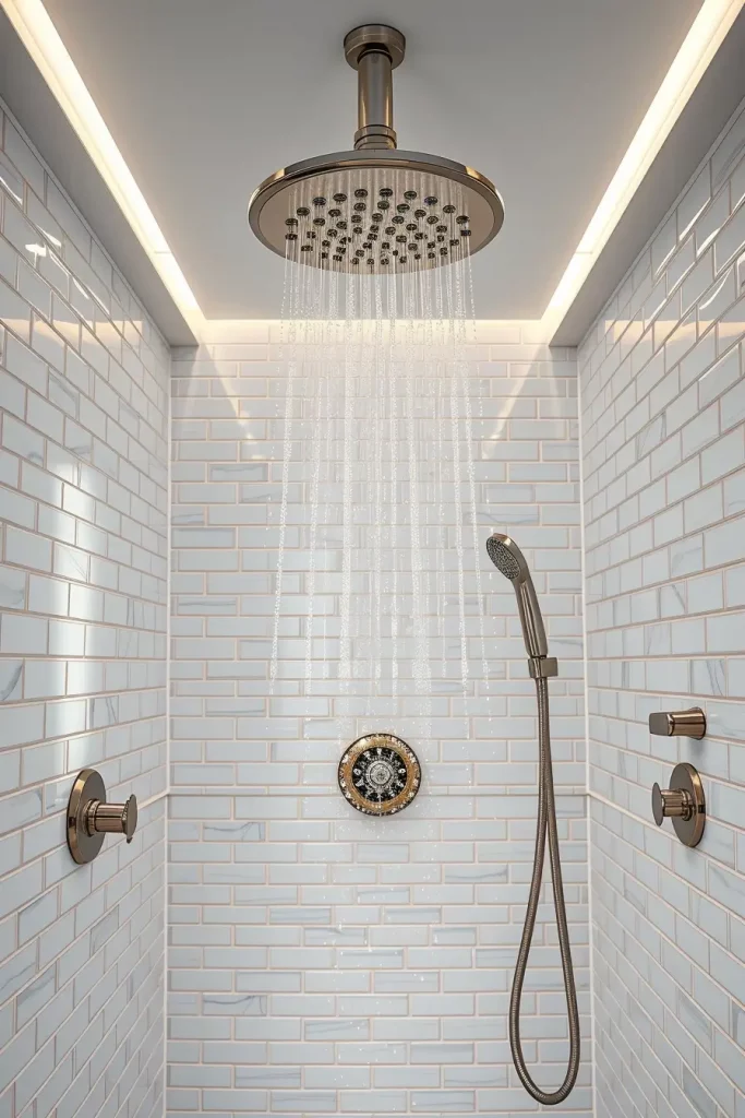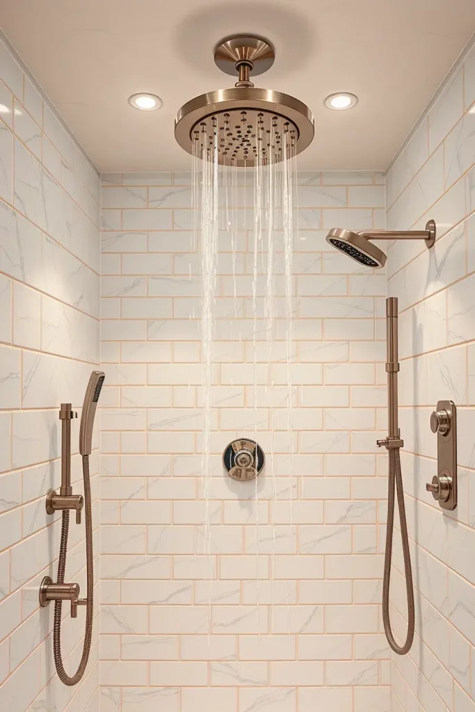 I combine them with thermostatic controls and wall jets or even hand held for flexibility. Such finishes as brushed nickel or matte black are very good in both contemporary and rustic settings. The appearance is also embellished by a clean tile background, such as slate or white zellige.