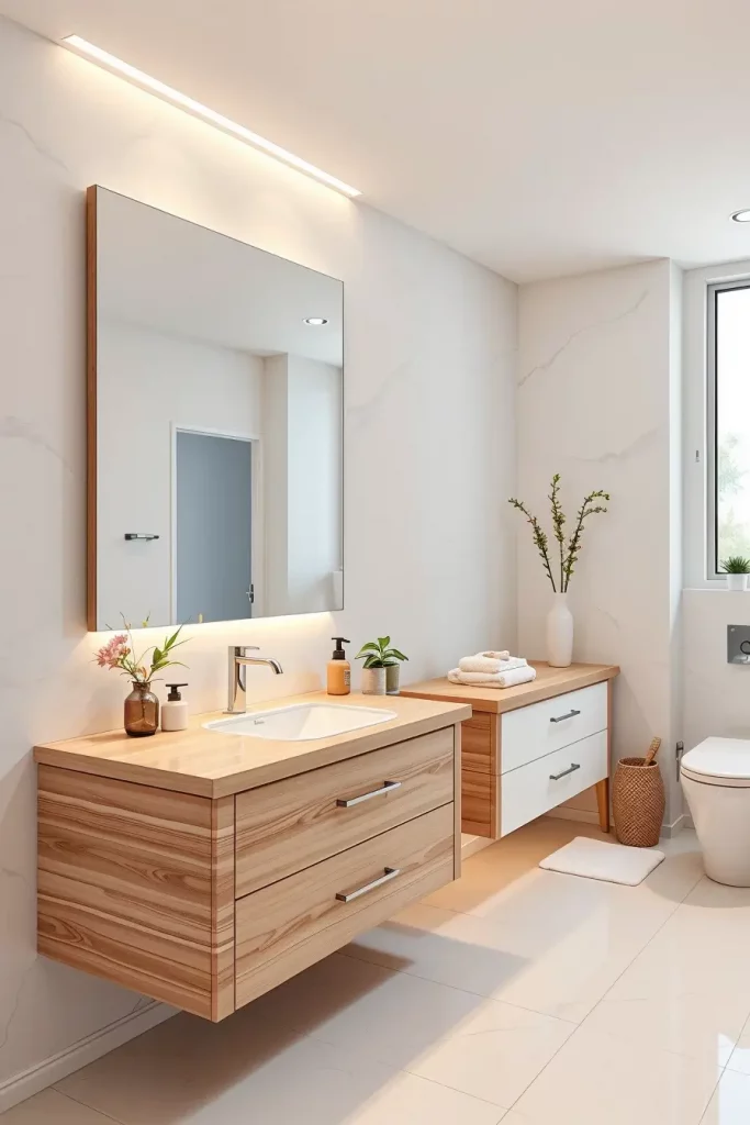 Floating vanity is one of my default upgrades in any spa like bathroom. These wall structures make them appear like a bigger space, which is essential in bringing in an open airy atmosphere. The simple design is in harmony with clutter-free aesthetic of spa interiors and sweeping the floor beneath is much easier.