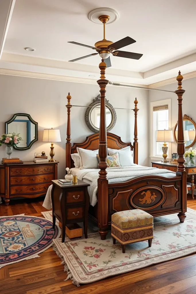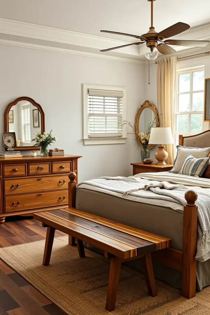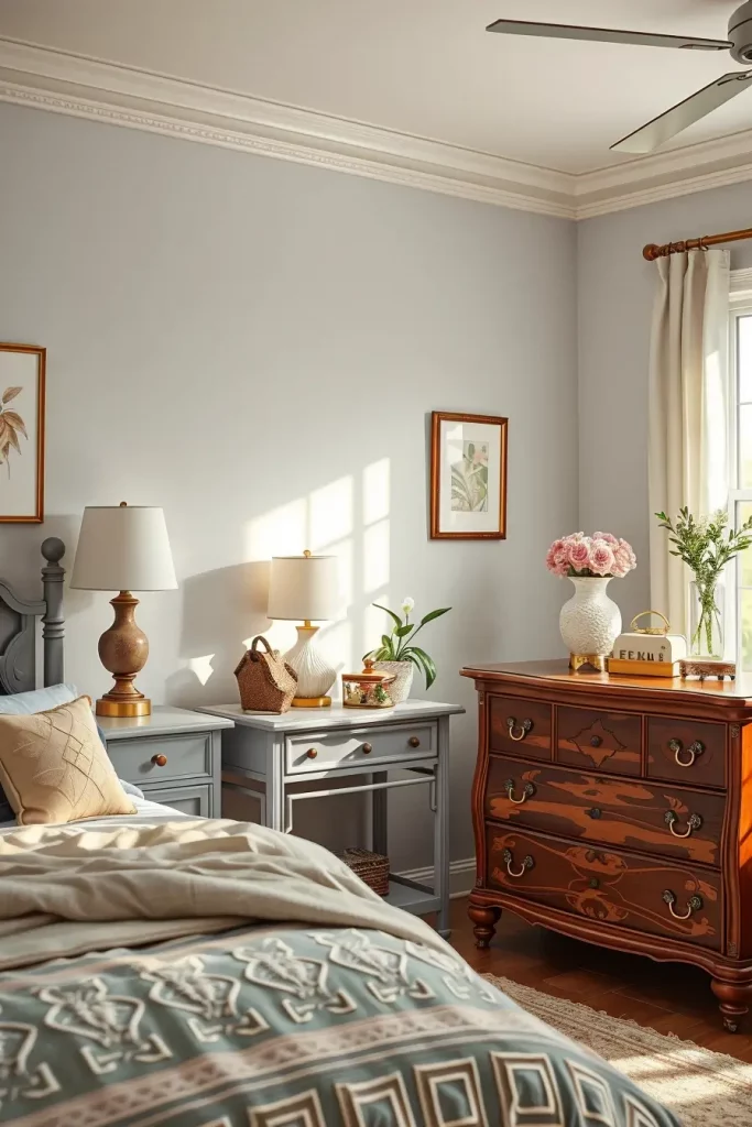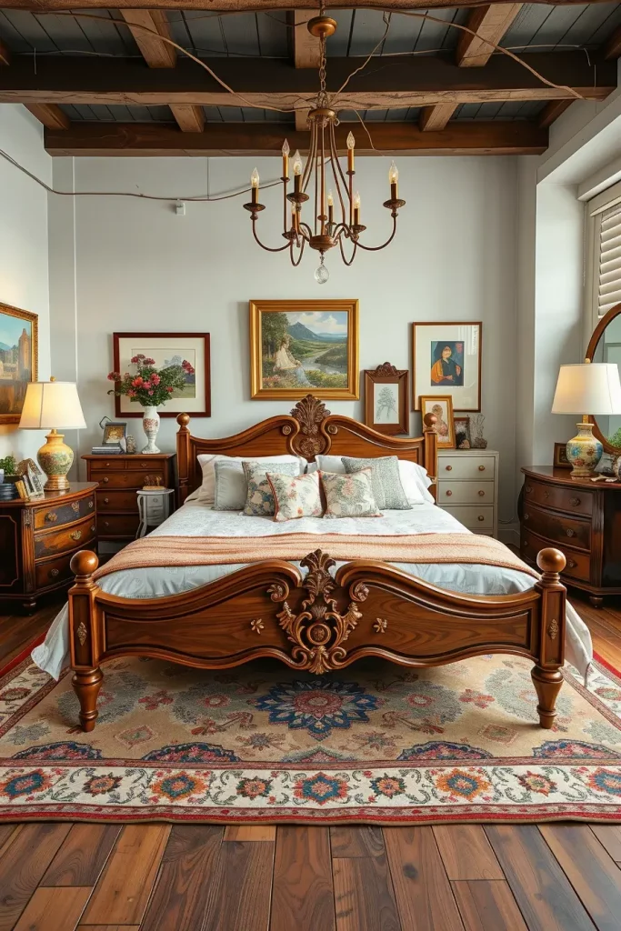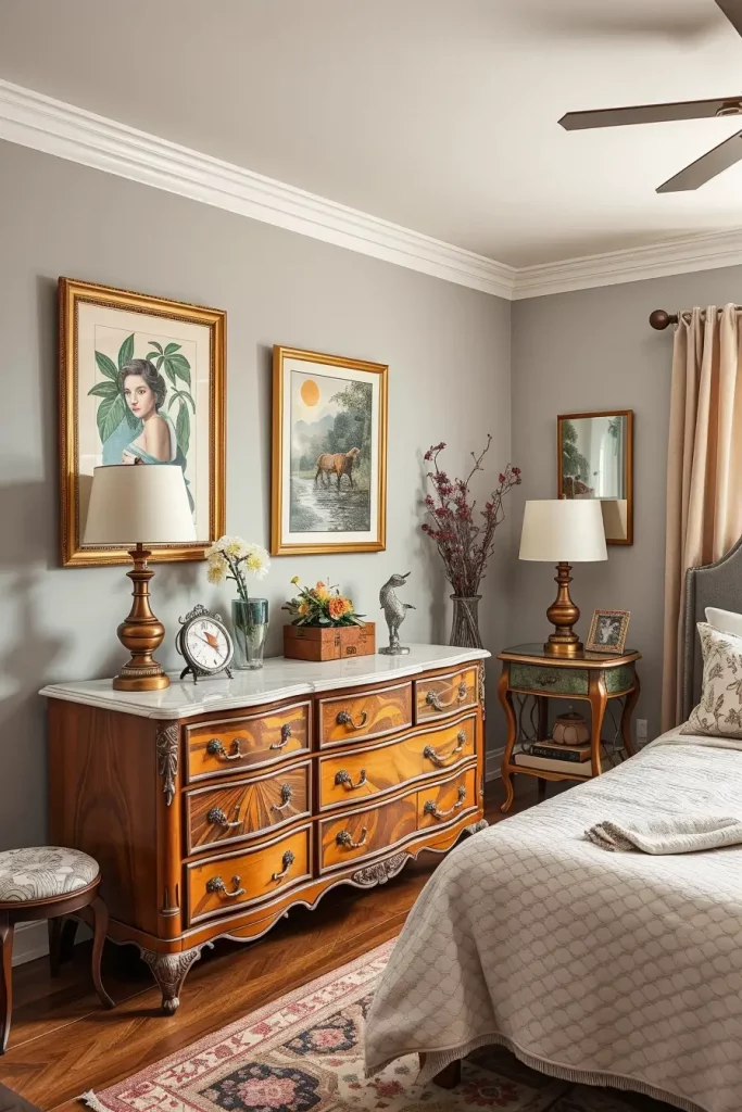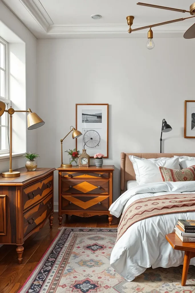Adding complementary accessories, such as secondhand lamps or thrifted mirrors, helps highlight the beauty of vintage furniture and ties the whole bedroom design together.