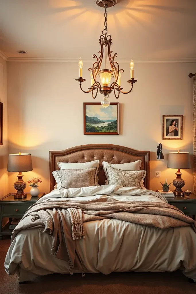 Lighting is often overlooked, but in my experience, it’s one of the most powerful ways to transform a bedroom. Thrift stores often have unique lamps and chandeliers that bring personality into the space. A well-placed thrifted lamp not only provides function but also serves as a statement piece.