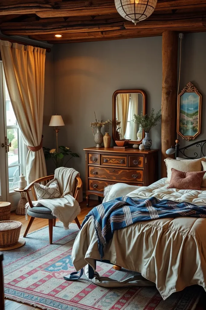 For me, vintage furniture often becomes the defining element of a thrifted bedroom. A sturdy antique dresser or a hand-carved wooden bed frame anchors the room, giving it character and presence. These pieces create a strong focal point that sets the tone for the rest of the decor.