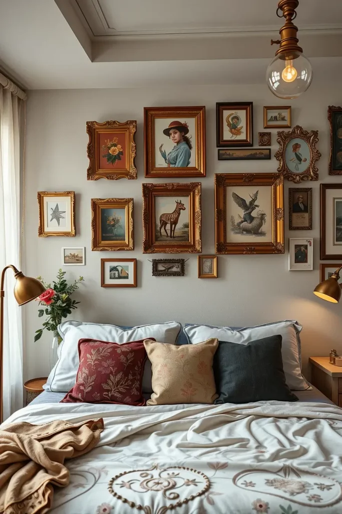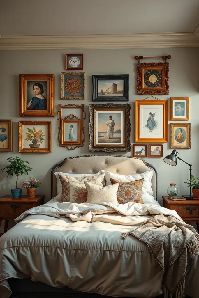 I love mixing thrifted frames of different sizes and finishes to create a gallery wall above the bed. A mismatched collection of ornate frames, simple wood frames, and even repurposed ones brings warmth and individuality. The artwork itself doesn’t have to be expensive—sometimes a simple print in a thrifted frame feels just right.