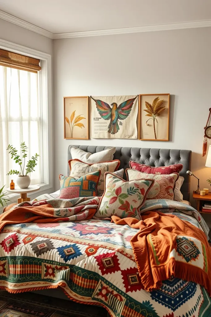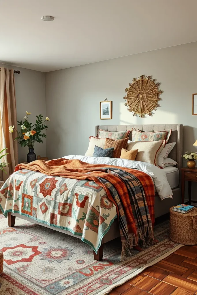 I often layer quilts at the foot of the bed, use secondhand throw pillows with unique fabrics, or add vintage blankets over modern duvets. These touches make the bed look inviting while also showing personality.
