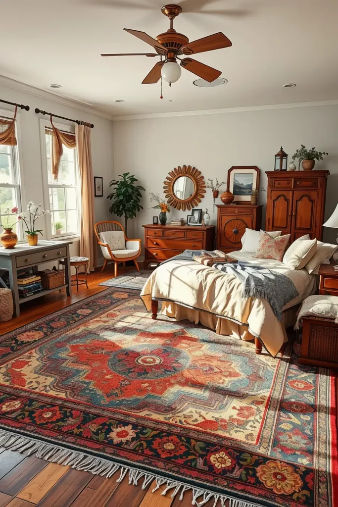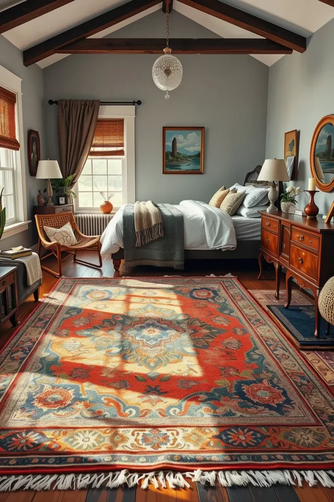 Thrifted rugs are often statement makers in a bedroom. I’ve found that vintage rugs bring warmth, color, and texture to a room in ways that plain modern rugs cannot. Whether it’s a Persian rug with intricate patterns or a simple woven mat, these pieces create grounding for the rest of the decor.