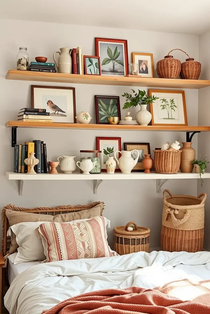 Open shelving is one of the most versatile ways to display thrifted bedroom decor. I like to mix practical items, such as baskets, with smaller decorative finds like vases, framed art, or ceramics. Thrift stores are full of small-scale items that may not stand alone but come together beautifully when arranged thoughtfully.