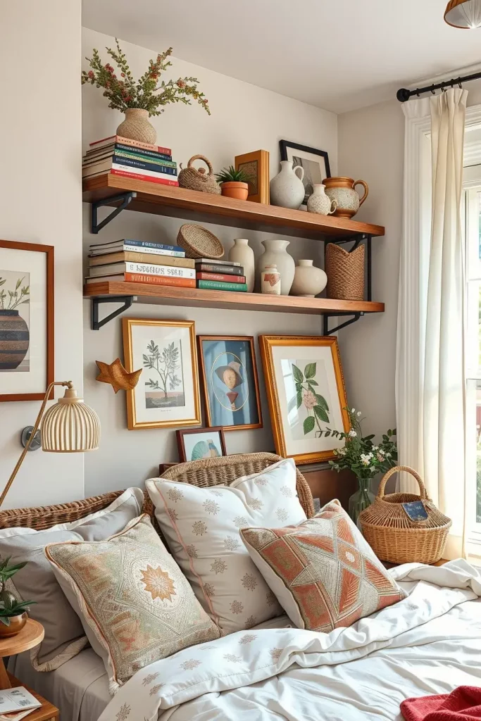 Each shelf should be layered with different textures and heights. For example, a stack of thrifted books can support a small vintage clock, or a ceramic vase can balance out picture frames. Adding greenery or candles ties everything together. This type of styling creates a collected look that feels authentic.
