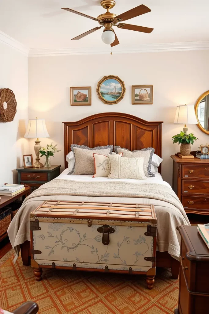 Practical storage doesn’t have to come from new purchases. In fact, some of my favorite solutions have been thrifted items that I repurposed for bedroom use. Old trunks, wicker baskets, or even sideboards can function as stylish storage. A trunk at the end of the bed, for instance, doubles as both a design statement and a practical place for extra blankets.