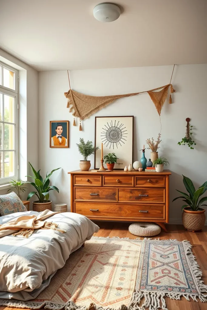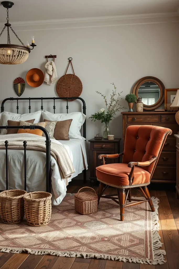 When arranging items, I like to pair opposites: a smooth thrifted glass lamp beside a woven wicker basket, or a velvet chair against a reclaimed wood dresser. These contrasts bring visual richness and tactile comfort to the bedroom.