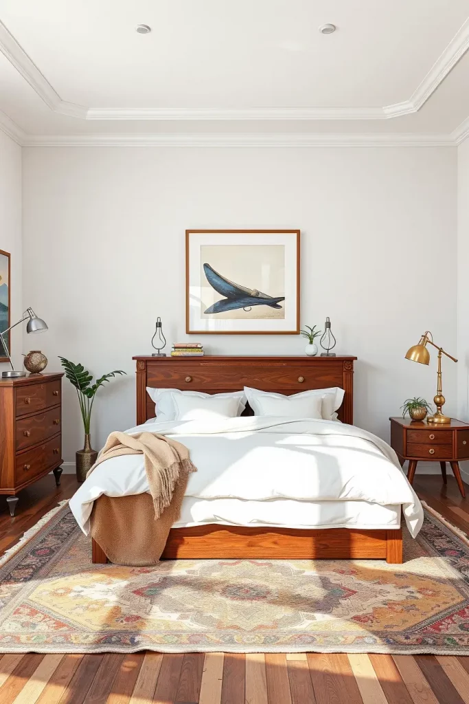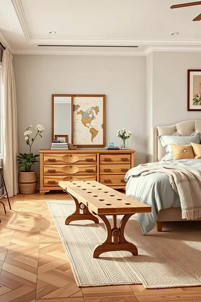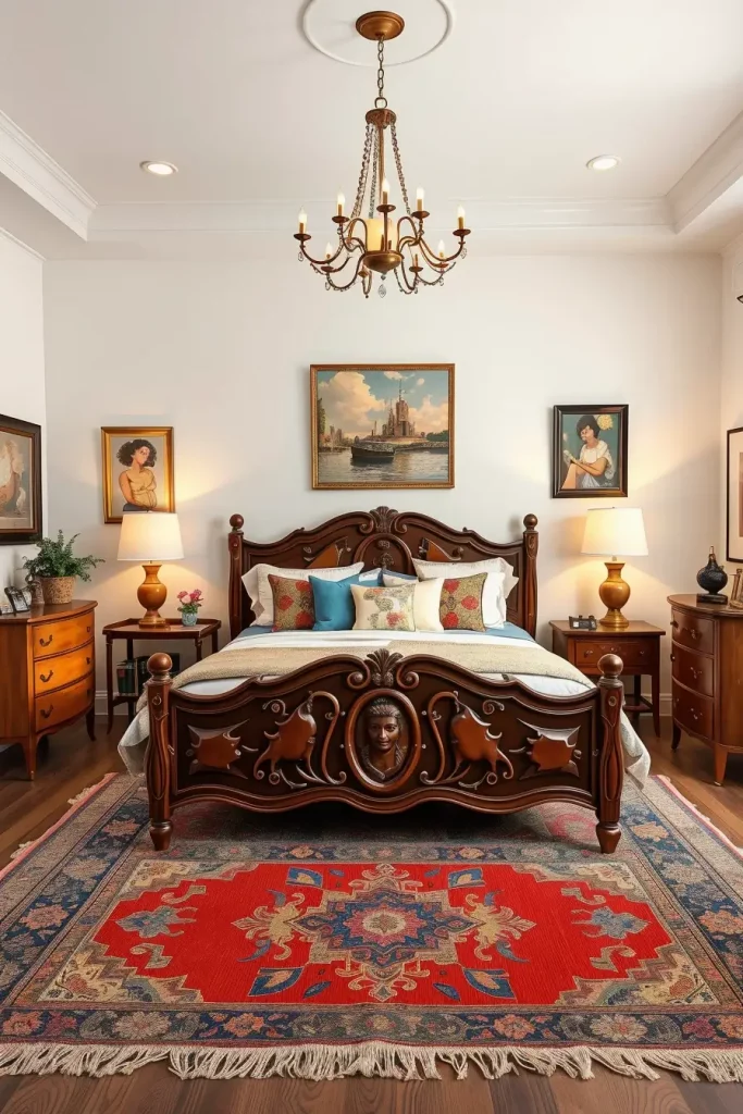 I prefer antique dressers with marble tops or vintage nightstands with brass handles. They bring a touch of elegance and craftsmanship to the space while serving practical storage needs. Mixing them with a modern bed or clean-lined rug creates a balanced style.