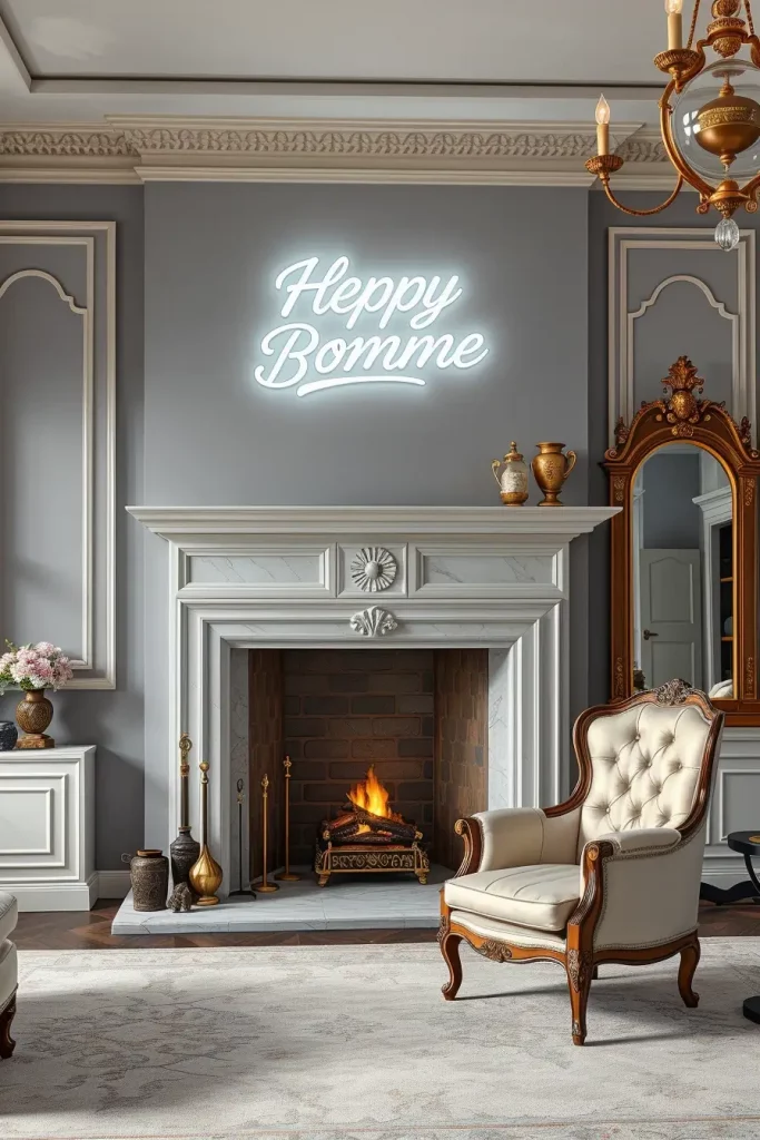 This design exists on the border of the classical symmetry and the brave urbanism. A marble fireplace mantel, carved ornaments and all, establishes a stately, yet down to earth vibe, which is balanced out by bright neon signage suspended above it. I have created such a room with high ceilings, neutral wall color and one striking focal wall.