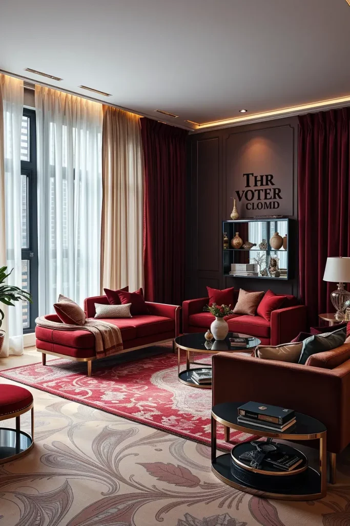 In this area the living room is converted into a futuristic playhouse by using heavy, draping curtains in deep velvets or silks with a contrast of sleek, modernist furniture. Imagine, Broadway and Blade Runner. I apply bold colors, such as deep burgundy, sapphire or emerald, and combine them with cool-toned metallics, brushed steel and silver.