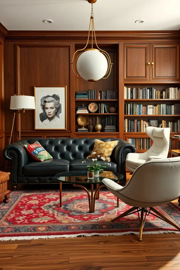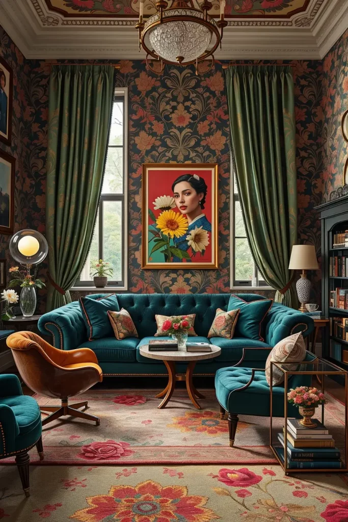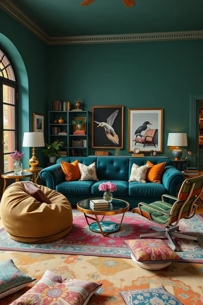 There is nothing that breaks convention quite like Velvet tuxedo sofa placed next to a neon green 1990s beanbag. It is one of my beloved interpretations of a retro eclectic living room a literal history of lounging. From the structured elegance of the 1940s to the squishy casualness of the ’90s, it’s a celebration of comfort across decades.