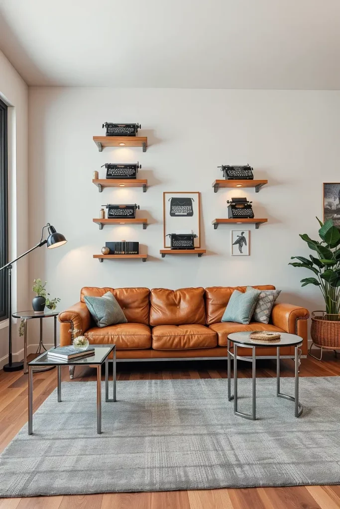 The main details are reclaimed wood hover shelves sealed with hidden brackets, each supporting a one-of-a-kind antique typewriter, maybe a 1920s Underwood or a 1960s Olivetti. A low-slung modernist leather couch in camel color balances it out below, and glass-topped side tables with chrome legs bring in a minimalist element. The palette is kept down to earth with a wool tonal gray rug.
