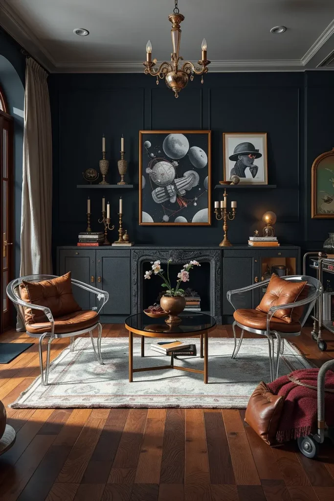 I prefer to add a Chesterfield sofa in a neutral color and add embroidered velvet pillows in the design of constellations or mythological animals. One side table can contain a unicorn figurine made of glass and another arc lamp can stretch over it casting its light on a low profile area rug with cloud like designs. I place abstract art above the mantle in which a flying saucer is concealed within a Victorian-style scene. That is the matter of surprise and balance.