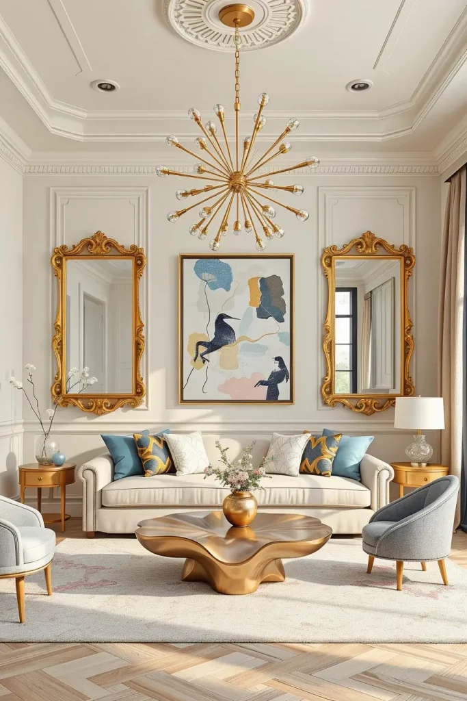 Here the sumptuous curves of the Rococo-style gold leaf frames take a dominant role in the setting of the 1950s Atomic Age decor. I have witnessed this succeed spectacularly in rooms which are attempting to generate instant disparity between periods but still wish to sing the praises of their individuality. The walls are cafe au lait or pearl so they do not clash, and the frames hold the design in place like elaborately decorated windows into the past. In the meantime, the futuristic touch is added with a sense of humor and style by Sputnik-like chandeliers and amoeba-form coffee tables.