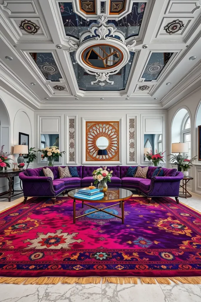I placed a fuchsia Persian rug on top of a deep sapphire one, and left the edges showing on purpose. The furniture consists of a brushed-metal sectional, royal purple upholstered and a lacquered, coffee table that is illuminated beneath. There is a white coffered ceiling above which is inlaid with programmable LED strips that reflect constellations.