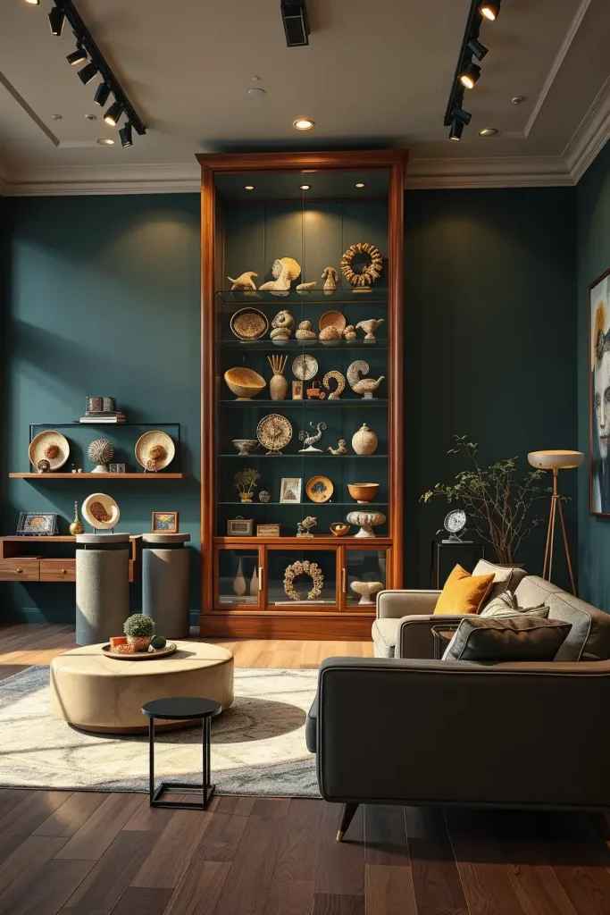 I always thought that collections are not meant to be locked away. This living room idea creates a dedicated curiosity cabinet filled with retro oddities—from 1950s lunchboxes to anatomical models from the ’20s. It is personal and visual storytelling at the best.