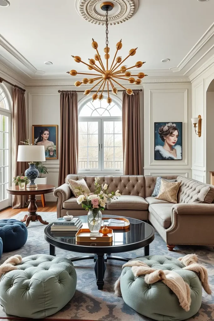 I began with a matte black Sputnik chandelier having brass arms and exposed globe bulbs. A tufted sectional sofa is framed by two Queen Anne-style side tables, one made of walnut, and the other painted in mint green below it. The play of traditional curves and angular lighting is an attention-catcher and the rest of the room is completed with the help of the supporting accents such as mirrored trays, velvet poufs, and chrome wall sconces.