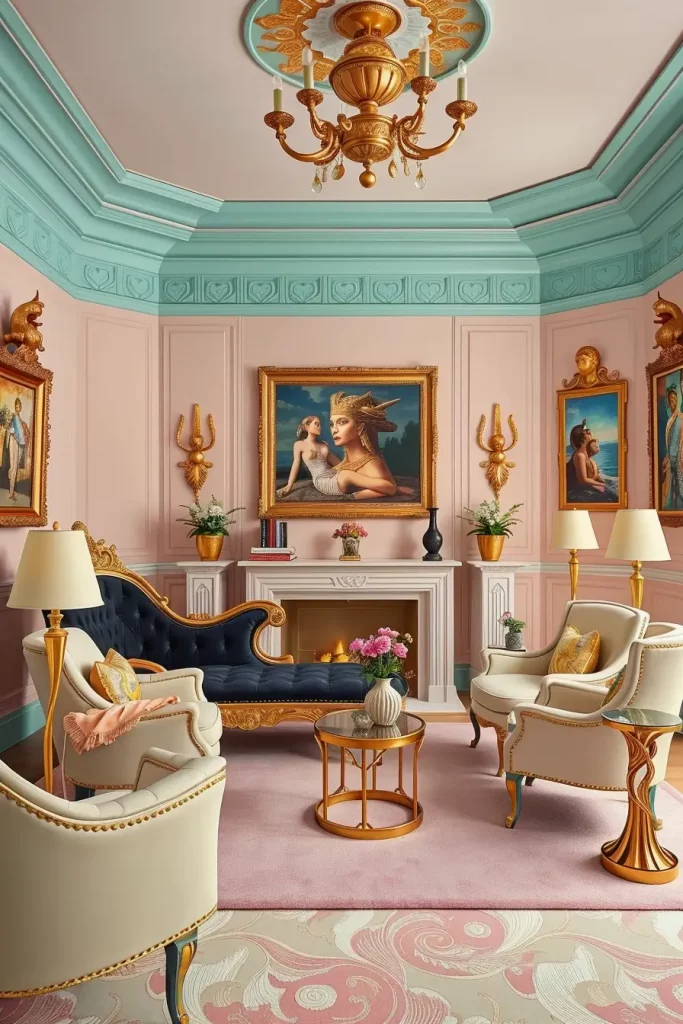 I began by black and gold chaise lounge with lotus carvings, a reference to the Egyptomania of the 1920s. Around it are postmodern armchairs of pastel squiggles and Memphis-style side tables. The walls are very lightly blush and the crown molding is painted turquoise. It also has a totemic sculpture corner and gold plated obelisk-shaped mirrors.
