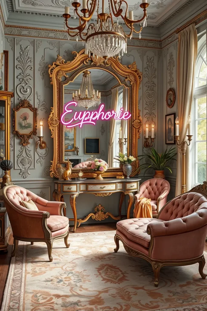 A huge mirror, of baroque style with an elaborate gold frame, becomes the focal point of the room. It is flanked by a mirrored console table below and an Euphoria sign in neon-pink above. The seating consists of blush velvet barrel chairs as well as a leather fainting couch. Frosted glass bulbs in wall sconces give contrast to the flashy neon.
