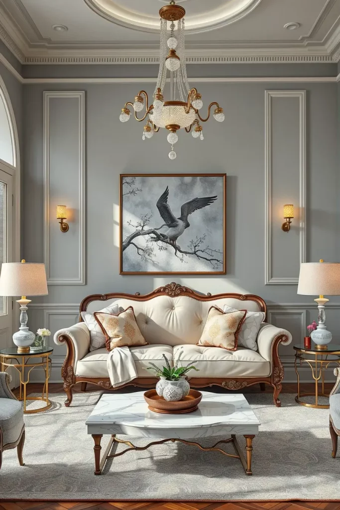 The idea of this combination does not make sense, and this is the point where it functions. I was curious to discover what would occur should I match the mid-century futurism of Sputnik-style lighting with the lavish curves of Queen Anne tables. The effect is a retro and whimsical vintage eclectic living room that does not take itself too seriously. It is royal and revolutionary.