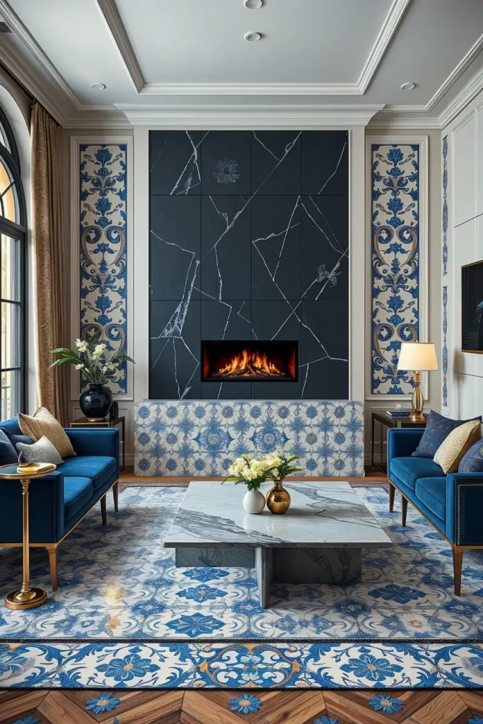 The fireplace is a rectangular insert without a frame inserted into a wall made of black slate. Ancient blue-and-white hand-painted tiles make a border all around it and extend over the hearth. The surrounding furniture (a velvet sectional in rich sapphire, a concrete coffee table, and chrome floor lamps) is also nearby. The room becomes cozy and futuristic at the same time.