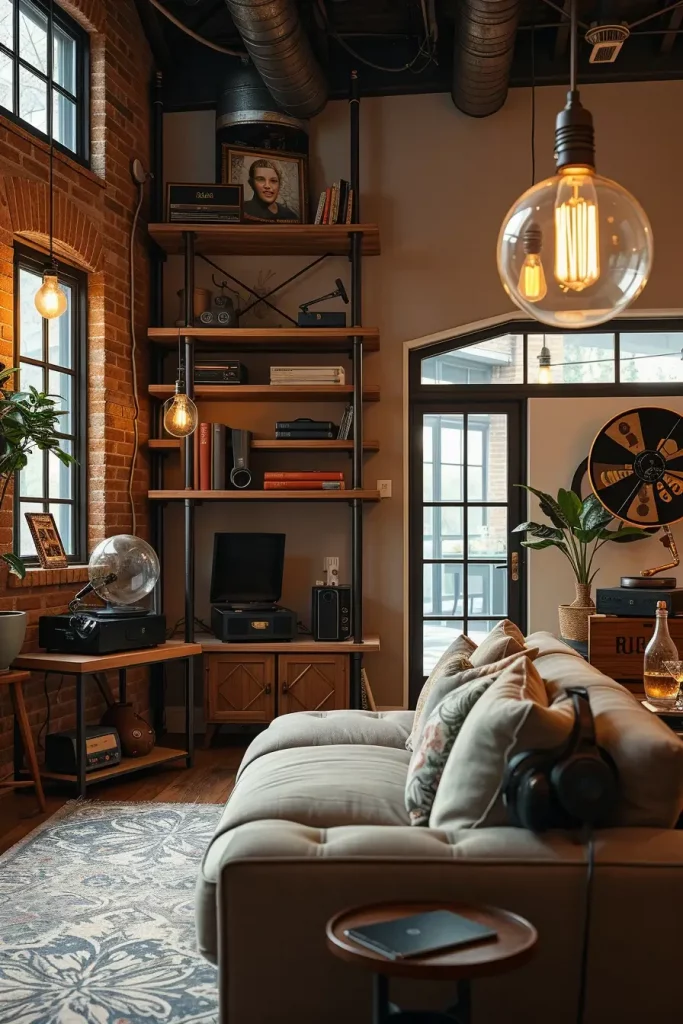 Among the more vibrant ideas of blending the past and the future in a vintage eclectic living room is the intentional contrast on open shelving. Here, I pile glass domes, antique phonographs, and state-of-the-art VR headsets to produce visual conflict and balance. This mixture is a story that does not respect time but the imagination. Displaying these disparate items together on repurposed wood or metal shelving units helps them seem designed, as opposed to disorganized.