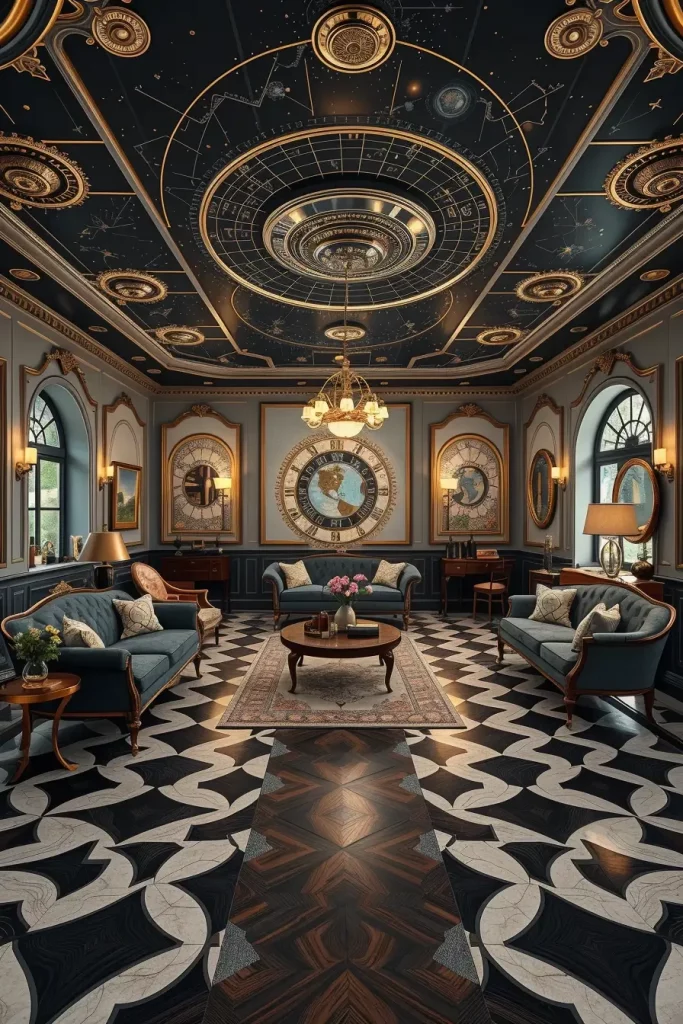 It is said that floor and ceiling treatments are noticed yet unnoticed and in a vintage eclectic home, it provides the best canvass to stretch limits. I also adore trompe-l foul methods to make pictures with optical illusions that puzzle the eye. Whether it’s a black-and-white checkered floor with depth tricks or a ceiling painted like a star map, these designs create dimension and whimsy without clutter.