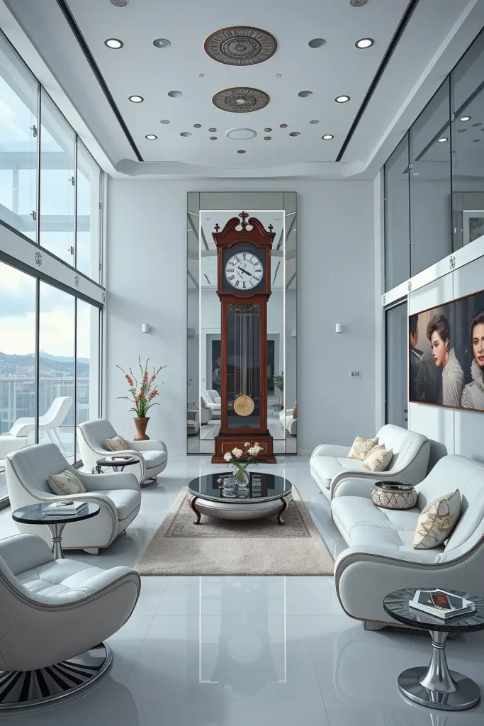 To enhance this arrangement I would suggest replacing a classic coffee table with a floating glass orb coffee table design or introduce holographic acrylic placemats on the antique tables to enhance the time bending illusion even further.