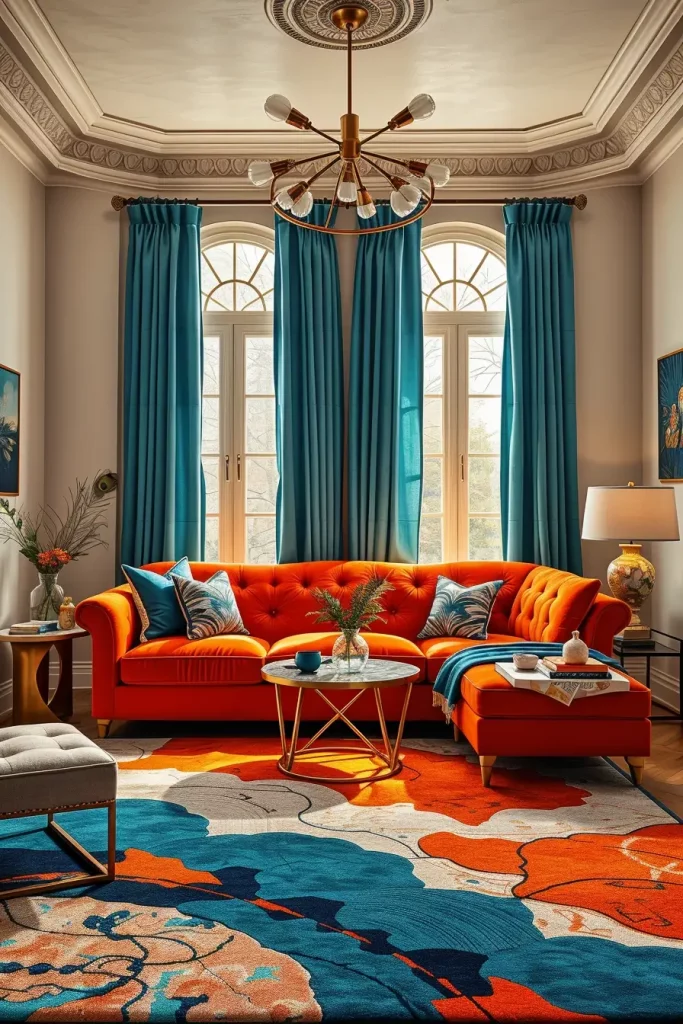 A tangerine velvet sectional is also a good place to begin and make the center of the room. I surround it with art deco teal curtains, peacock feather patterns and opulent brass chandeliers. The influence of the 1920s is embodied in a terrazzo-clad side table or an etched glass coffee table that helps to keep things in check.