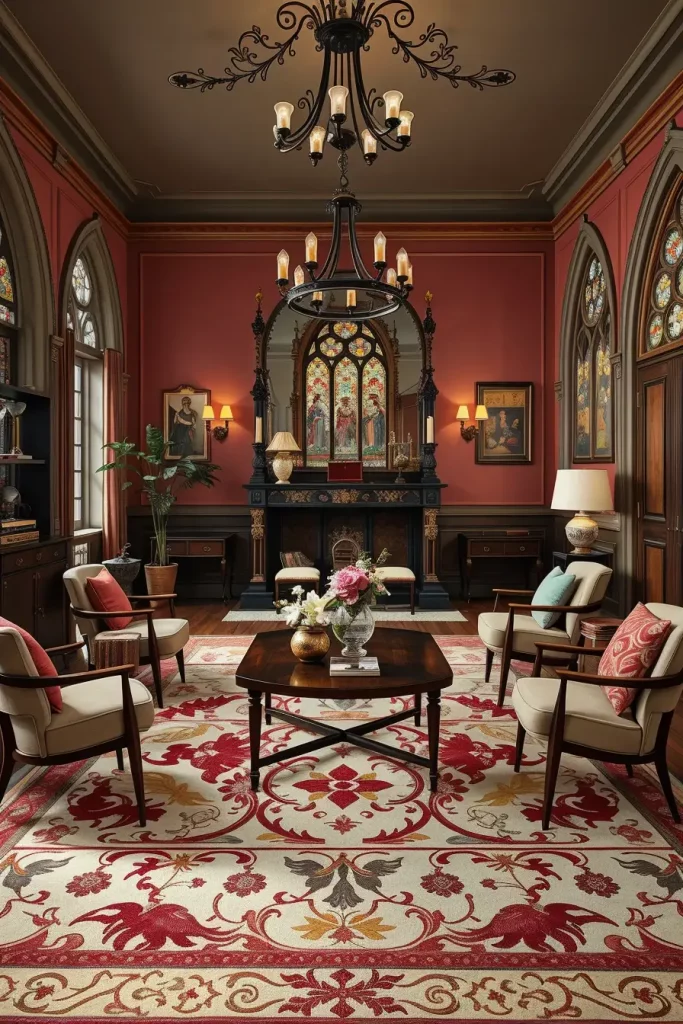 I concentrate on matching Gothic Revival bookshelf or altar table with low-slung walnut furniture. The colors are inclined to burgundy, black and taupe. I will also tend to play with lighting as a form of drama- such as an iron chandelier with a low wattage beside a smooth sconce. Teak-framed sofas harmonize well with ornamental mirrors that have a pointed arch.
